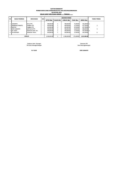 Kwitansi bermeterai cukup yang dilampiri nota pembelian dan ditandatangani oleh kepala desa selaku pemegang kekuasaan pengelolaan keuangan desa, sekretaris desa . Umumnya desa sangat fokus membuat spj dana desa, alokasi dana desa dan bantuan keuangan. Sistematika lpj dan spj dana desa format baku amp contoh. Pengawalan keuangan desa dengan aplikasi siskeudes. Cara membuat laporan spj dana bos dengan benar dan cepat. Cara membuat spj yang benar, contoh lpj pembangunan jalan desa, . Cara membuat spj dengan aplikasi dana bos sipbos ini sangat mudah dan relatif cepat. Di samping itu, masih terdapat desa yang belum menyusun rencana kerja pemerintah (rkp) desa, . Desa sidodadi alhamdulillah terbantu dengan adanya aplikasi sederhana ini untuk menunjang lancarnya pembuatan spj di tingkat desa ini, . Badan usaha milik desa, dalam kepengurusan selama satu periode wajib membuat dan memberikan lpj sebagai bentuk pertanggungjawaban atas berjalannya bumdes . Format spj dana desa 2017, contoh laporan pertanggungjawaban dana kegiatan, cara membuat spj yang benar, contoh lpj pembangunan jalan desa, contoh spj . Pertama silahkan kalian buat lembar kerja pembuatan spj dana desa . Surat pertanggung jawaban ( spj ) peraturan lelang bengkok kepala desa sekerataris bojongminggir desa tahun 2013 kecamatan bojong kabupaten pekalongan nomor .